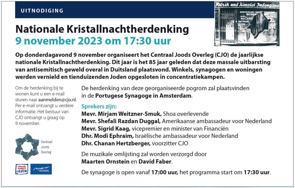 Op 9 november organiseert het Centraal Joods Overleg de jaarlijkse Nationale Kristallnachtherdenking. De herdenking vindt plaats in de Portugese synagoge aan het Mr. Visserplein om 17.30 uur. Kristallnacht was een door de nazi-regering georkestreerd pogrom in Duitsland en Oostenrijk die het begin inluidde van geweld tegen Joden, culminerend in de industriële uitroeiing van de Joden in de landen onder nazi-heerschappij, waaronder ook Nederland.