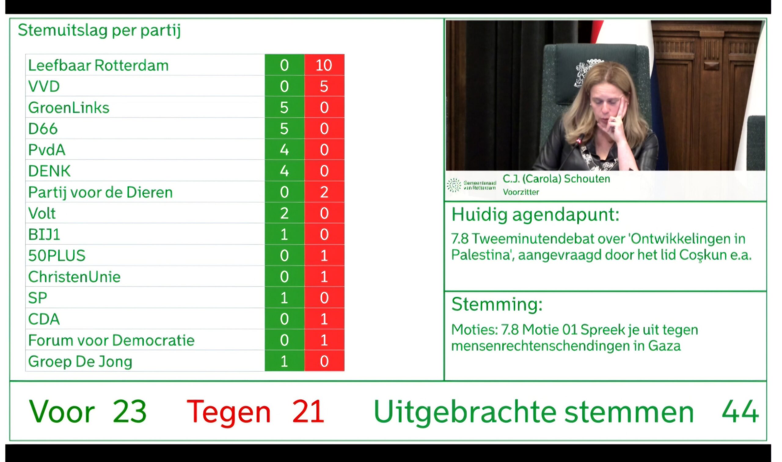 Opnieuw heeft de gemeenteraad van Rotterdam haar Joodse inwoners in de kou gezet. Dat constateren het Centraal Joods Overleg en de Joodse Gemeente en de Liberaal-Joodse Gemeente in Rotterdam naar aanleiding van het aannemen van een motie over mensenrechten in Gaza en wat de motie noemt ‘de rest van Palestina’, terwijl het hier een internationaal conflict betreft waar de Raad geen moties over zou moeten behandelen/steunen.