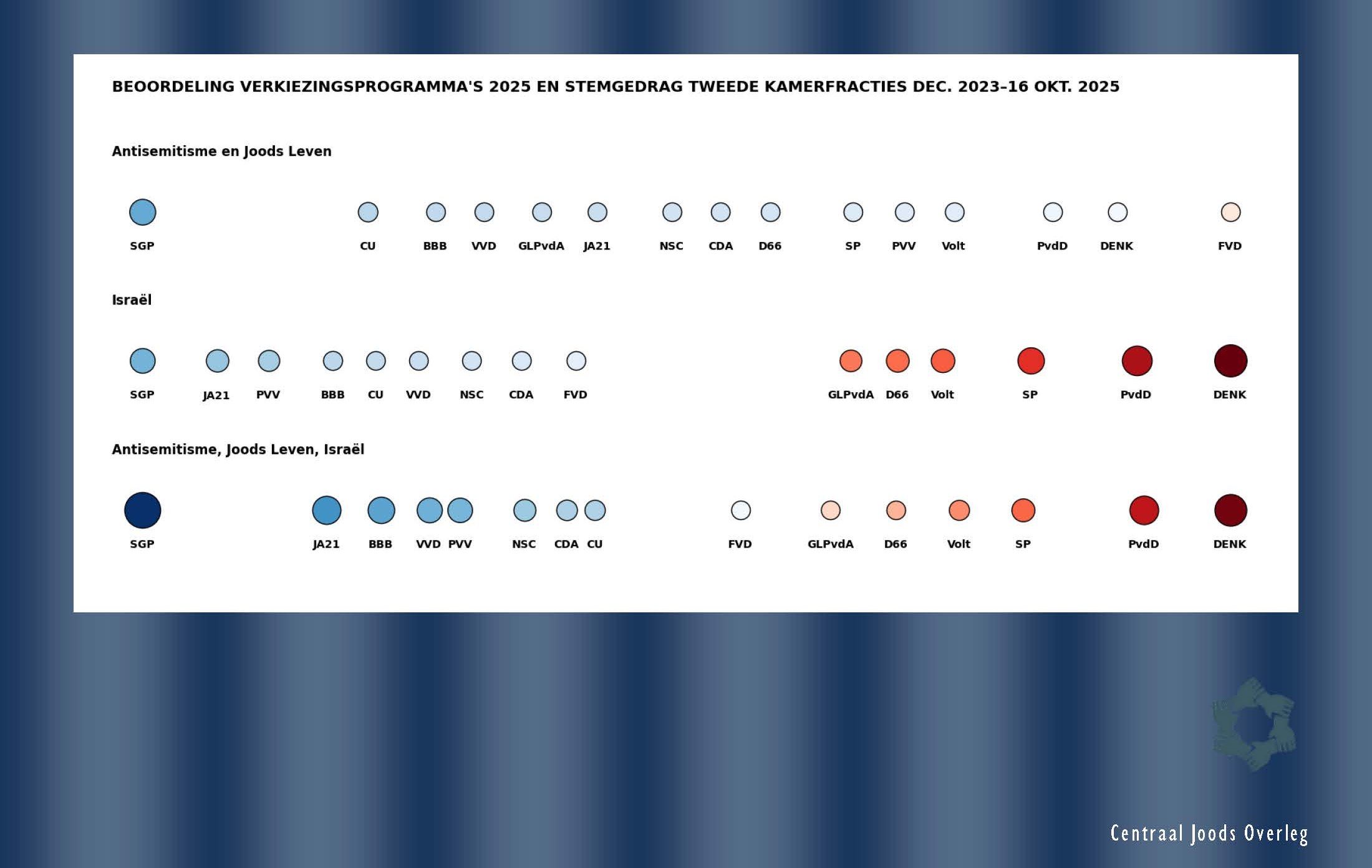 Het Centraal Joods Overleg (CJO) heeft een beoordeling gemaakt van de verkiezingsprogramma’s en het stemgedrag van de partijen die momenteel in de Tweede Kamer vertegenwoordigd zijn. Daarbij is gekeken naar hun standpunten en stemgedrag op de thema’s antisemitisme, het bevorderen van Joods leven, de herinnering aan de Holocaust en standpunten over Israël.